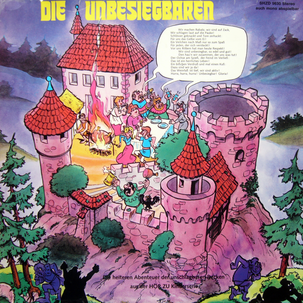 Auf der Burg Schwarzenstein sinnt der böse Herzog Utz von Schwarzenstein darüber nach, wie er sich der Burg der Lichtenfälser, die man auch die Unbesiegbaren nennt, bemächtigen kann. Ob seine düsteren Pläne Erfolg haben und wie die Geschichte um die Lichtenfälser, die Schwarzensteiner, Hotte Rotbarts Räuberbande, drei Blechschneider und einen Alchimisten ausgeht, erzählt diese erste von drei LPs mit Abenteuern der Unbesiegbaren.