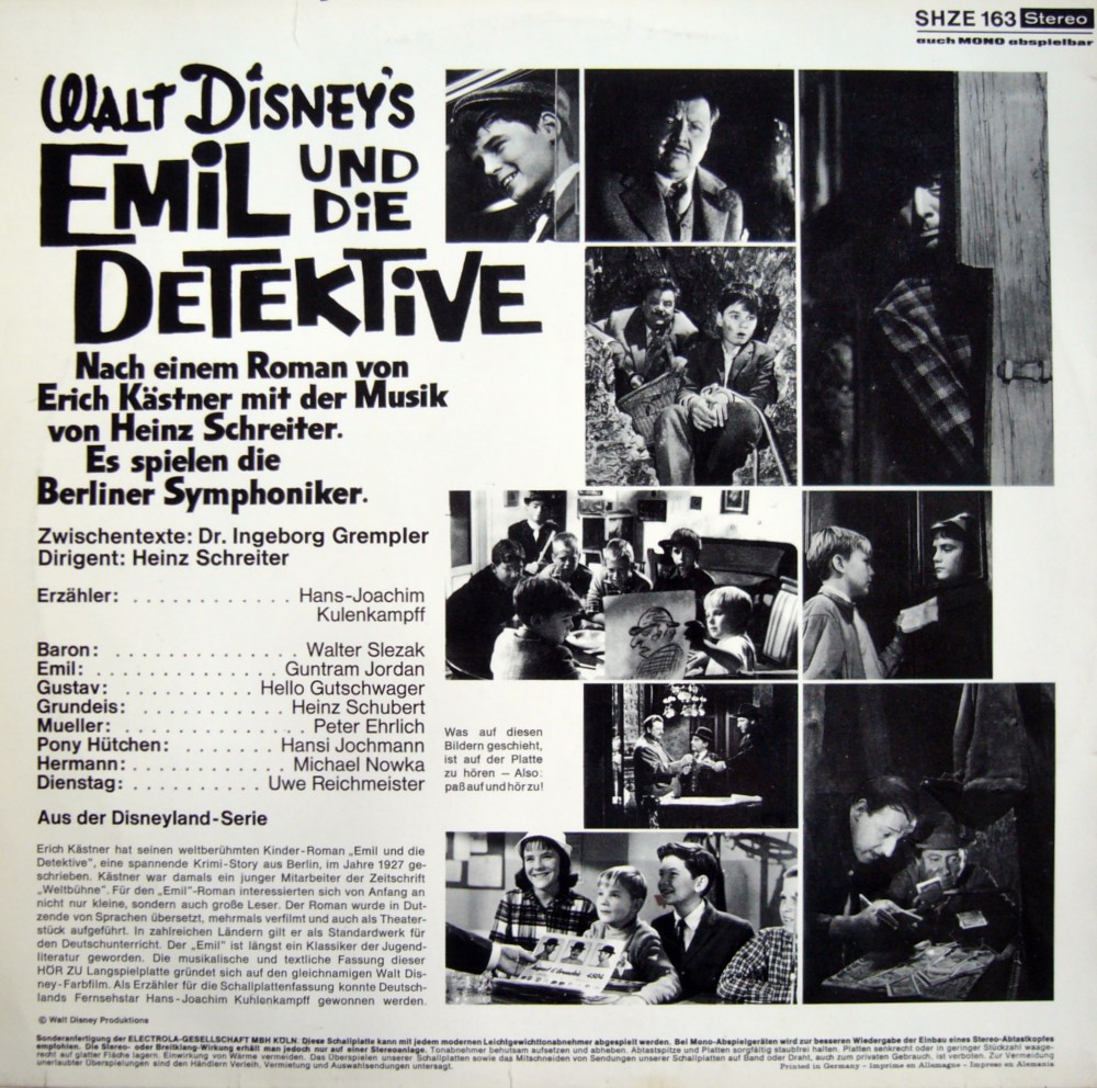 Hörspiel nach dem Walt Disney Film Emil und die Detektive nach dem Buch von Erich Kästner. HÖRZU Sonderfertigung der ELECTROLA aus der Disneyland-Serie. Mit Hansi Jochmann die deutsche Stimme von Jodie Forster. Auf der Rückseite des Covers sind Bilder aus dem Film. Zwischentexte: Dr. Ingarborg Gremple