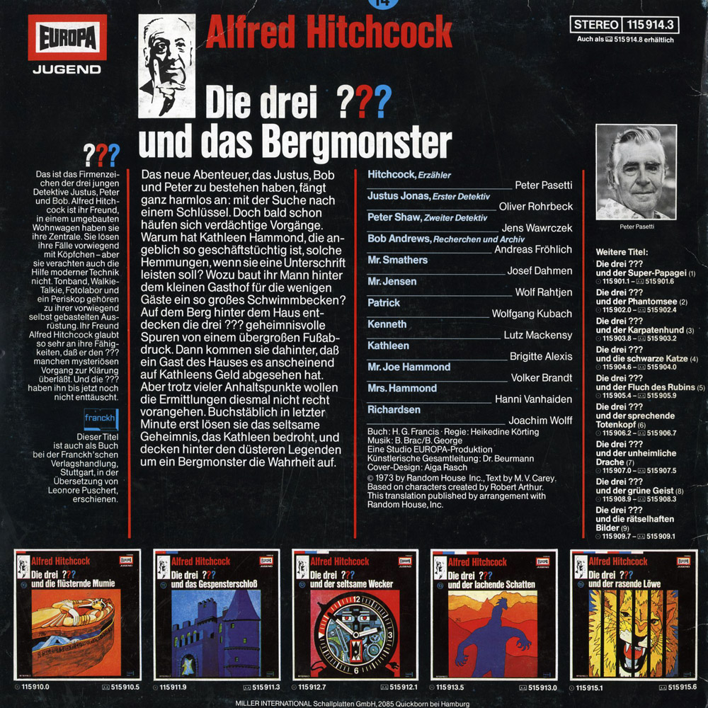 Ansonsten fand ich das Bergmonster eigentlich immer eine überdurchschnittliche Folge. Die Gebirgsatmosphäre war damals etwas Ungewöhnliches, sowas hatte es bis dahin in der Serie noch nicht gegeben. Sprecher wie Josef Dahmen, Volker Brandt und Hanni Vanhaiden waren auch sehr gute "Sidekicks" für die drei ???.