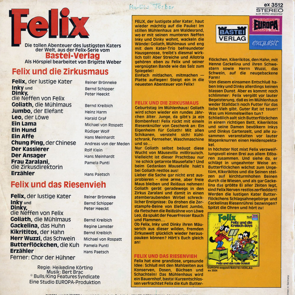 Felix hat eine grandiose, urgesunde Idee: Schluss mit den Mahlzeiten aus Konserven, Dosen, Büchsen und Schachteln! Das Mühlenhaus wird ein Bauernhof, basta! Kurz entschlossen verfrachtet Felix die Kuh Butterflöckchen, Kikerikitos, den Hahn, mit Henne Gackelina und ihren Schwestern sowie Herrn Wuzzi, das Schwein, auf die neugebackene Farm! Von diesem einsamen Entschluß haben Inky und Dinky allerdings keinen blassen Dunst. Aber es kommt noch schlimmer: Felix vergißt vor lauter Begeisterung, daß es im Mühlenhaus weder Stalldach noch Futter für das liebe Vieh gibt. Guter Rat ist teuer! Was um Himmelswillen tun? Schließlich aalt sich Butterflöckchen in einem richtigen Bett, Kikerikitos und seine Damen bevölkern Inkys und Dinkys Gartenzelt, und alle zusammen veranstalten vor lauter Magenknurren einen Heidenspektakel. In höchster Not mixt Felix verzweiflungsvoll einen Brei aus allem Eßbarem zusammen. Und siehe da, er schlägt in ungeahnter Weise an: Butterflöckchen wächst zum Ungetüm, Kikerikitos und die Seinen stelzen auf kirchturmhohen Beinen durch die Wiesen, und als gar Gackelina das größte Ei aller Zeiten legt, sind Felix' Nerven restlos zerfleddert! Werden die lustigen Kater Butterflöckchens Schlagsahnegebirge und Gackelinas Riesenrührei bezwingen? Spitzt die Ohren und hört zu!