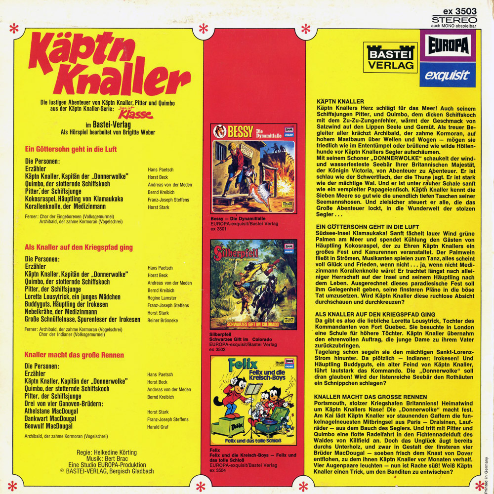 Käptn Knallers Herz schlägt für das Meer! Auch seinem Schiffsjungen Pitter, und Quimbo, dem dicken Schiffskoch mit dem Zu-Zu-Zungenfehler, wärmt der Geschmack von Salzwind auf den Lippen Seele und Gemüt. Als treuer Begleiter aller krächzt Archibald, der zahme Kormoran, auf hohem Mastbaum über Wellen und Wogen – mögen sie friedlich wie im Ententümpel oder brüllend wie wilde Höllenhunde vor Käptn Knallers Segler aufschäumen. Mit seinem Schoner "DONNERWOLKE" schaukelt der wind- und wasserfesteste Seebär Ihrer Britannischen Majestät, der Königin Victoria, von Abenteuer zu Abenteuer. Er ist schlau wie der Schwertfisch, der die Thune jagt. Er ist stark wie der mächtige Wal. Und er ist unter rauher Schale sanft wie ein verspielter Papageienfisch. Käptn Knaller kennt die Sieben Meere so gut wie die unendlich tiefen Taschen seiner Seemannshosen. Und zielsicher steuert er alle, die das Große Abenteuer lockt, in die Wunderwelt der stolzen Segler...
