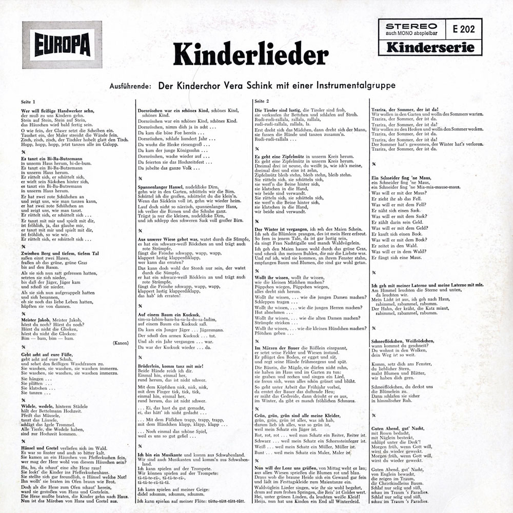 Wer will fleißige Handwerker seh'n – Es geht ein Bi- Ba- Butzemann – Zwischen Berg und tiefem, tiefem Tal – Meister Jacob – Gebt acht auf eure Füße – Widele, wedele – Hänsel und Gretel – Dornröschen war ein schönes Kind – Spannenlanger Hansel – Auf uns'rer Wiese gehet was – Auf einem Baum ein Kuckuck saß – Brüderlein, komm tanz mit mir – Ich bin ein Musikante – Die Tiroler sind lustig – Es geht eine Zipfelmütz' – Der Winter ist vergangen – Wollt ihr wissen – Im Märzen der Bauer – Grün, grün, grün sind alle meine Kleider – Nun will der Lenz uns grüßen – Trarira, der Sommer, der ist da – Ein Schneider fing 'ne Maus – Ich geh mit meiner Laterne – Schneeflöckchen, Weißröckchen – Guten Abend, gut' Nacht