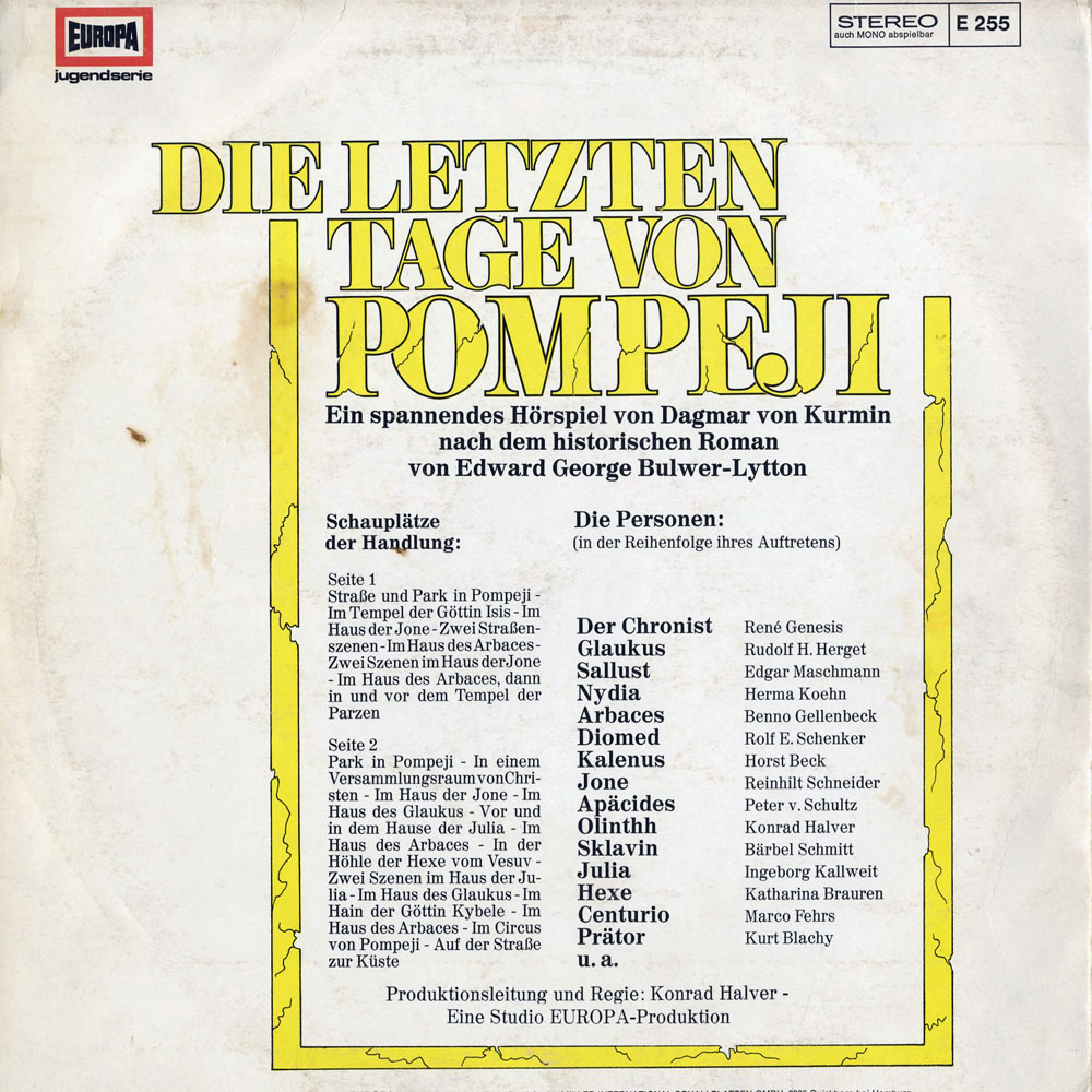 Straße und Park in Pompeji – Im Tempel der Göttin Isis – Im Haus der Jone – Zwei Straßenszenen – Im Haus des Arbaces – Zwei Szenen im Haus der Ione – Im Haus des Arbaces, dann in und vor dem Tempel der Parzen – Park in Pompeji – In einem Versammlungsraum von Christen – Im Haus der Ione – Im Haus des Glaukus – Vor und in dem Hause der Julia – Im Haus des Arbaces – In der Höhle der Hexe vom Vesuv – Zwei Szenen im Haus der Julia – Im Haus des Glaukus – Im Hain der Göttin Kybele – Im Haus des Arbaces – Im Circus von Pompeji – Auf der Straße zur Küste