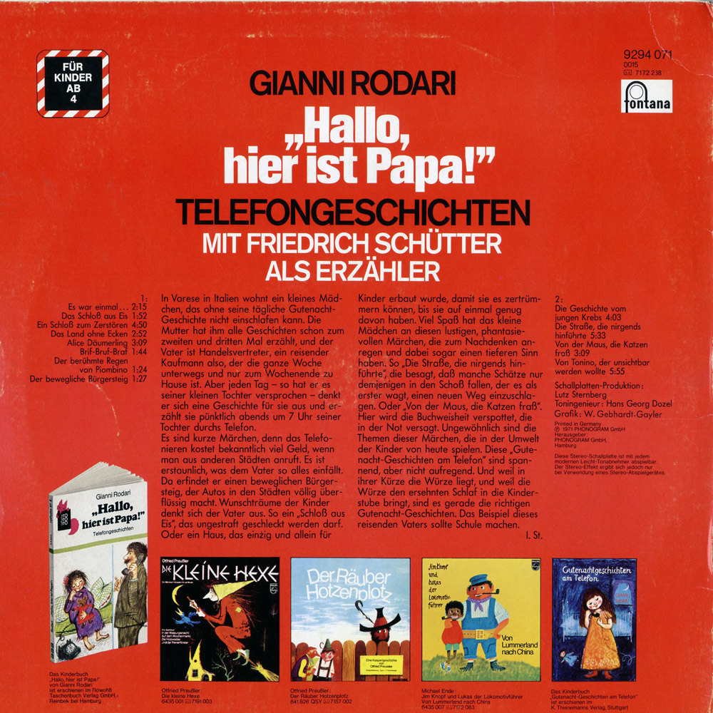 Es sind kurze Märchen, denn das Telefonieren kostet bekanntlich viel Geld, wenn man aus anderen Städten anruft. Es ist erstaunlich, was dem Vater so alles einfällt. Da erfindet er einen beweglichen Bürgersteig, der Autos in den Städten völlig überflüssig macht. Wunschträume der Kinder denkt sich der Vater aus. So ein "Schloß aus Eis", das ungestraft geschleckt werden darf. Oder ein Haus, das einzig und allein für Kinder erbaut wurde, damit sie es zertrümmern können, bis sie auf einmal genug davon haben. Viel Spaß hat das kleine Mädchen an diesen lustigen, phantasievollen Märchen, die zum Nachdenken anregen und dabei sogar einen tieferen Sinn haben. So "Die Straße, die nirgends hinführte", die besagt, daß manche Schätze nur demjenigen in den Schoß fallen, der es als erster wagt, einen neuen Weg einzuschlagen. Oder "Von der Maus, die Katzen fraß". Hier wird die Buchweisheit verspottet, die in der Not versagt. Ungewöhnlich sind die Themen dieser Märchen, die in der Umwelt der Kinder von heute spielen. Diese "Gutenacht-Geschichten am Telefon" sind spannend, aber nicht aufregend. Und weil in ihrer Kürze die Würze liegt, und weil die Würze den ersehnten Schlaf in die Kinderstube bringt, sind es gerade die richtigen Gutenacht-Geschichten. Das Beispiel dieses reisenden Vaters sollte Schule machen.