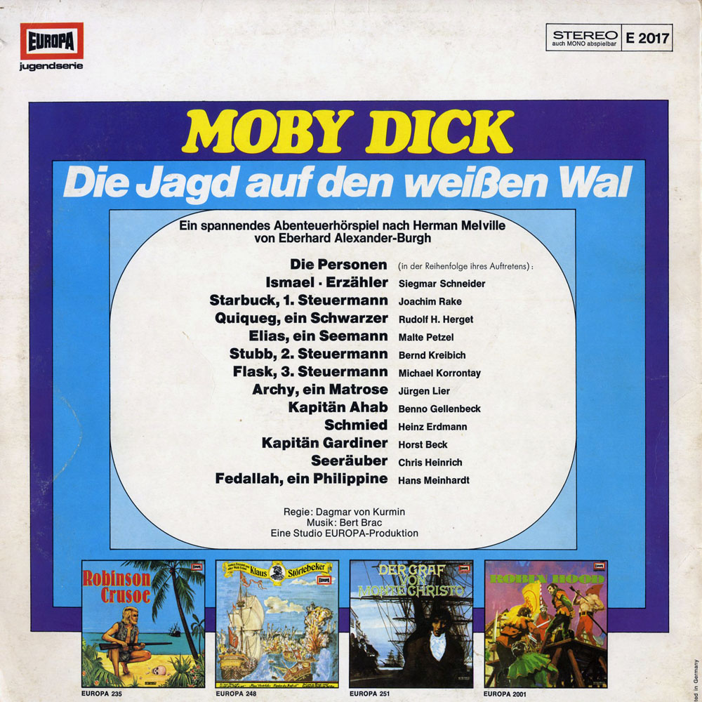 Jetzt zu der Lp. Gnadenlos gut! Da gibt es kein Pardon. Benno Gellenbeck als Ahab. Echt gruselig. Obwohl der Ahab von Maritim ist noch etwas fanatischer. Alleine die Szene mit Ququeg und der Fliege ist sehr gelungen. Ist in der MC und im "Original" leider nicht mehr drin. Achja und Ismaels beschreibung des Hafens fällt auf der Lp länger aus als auf den beiden anderen Medien. Meine Empfehlung seht zu das ihr die Lp bekommt. Ein komplettes Europa-Meisterwerk.