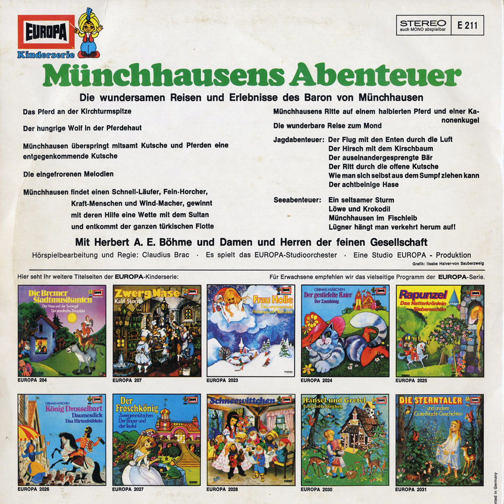 Das Pferd an der Kirchtumspitze – Der hungrige Wolf in der Pferdehaut – Münchhausen überspringt mitsamt Kutsche und Pferden eine entgegenkommende Kutsche – Die eingefrorenen Melodien – Münchhausen findet einen Schnell-Läufer, Fein-Horcher, Kraft-Menschen und Wind-Macher, gewinnt mit deren Hilfe eine Wette mit dem Sultan und entkommt der ganzen türkischen Flotte – Münchhausens Ritte auf einem halbierten Pferd und einer Kanonenkugel – Die wunderbare Reise zum Mond – Der Flug mit den Enten durch die Luft – Der Hirsch mit dem Kirschbaum – Der auseinandergesprengte Bär – Der Ritt durch die offene Kutsche – Wie man sich selbst aus dem Sumpf ziehen kann – Der achtbeinige Hase – Ein seltsamer Sturm – Löwe und Krokodil – Münchhausen im Fischleib – Lügner hängt man verkehrt herum auf