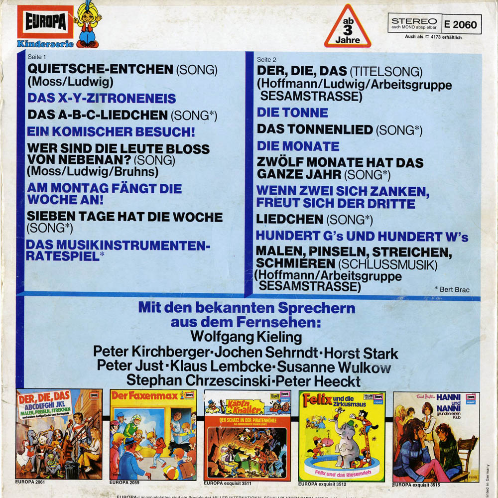 Quietsche-Entchen – Das X-Y-Zitroneneis – Das A-B-C-Liedchen – Ein komischer Besuch – Wer sind die Leute bloß von nebenan? – Am Montag fängt die Woche an – Sieben Tage hat die Woche – Das Musikinstrumenten-Ratespiel – Der, die, das – Die Tonne – Das Tonnenlied – Die Monate – Zwölf Monate hat das ganze Jahr – Wenn sich zwei zanken, freut sich der Dritte – Liedchen – Hundert G's und hundert W's – Malen, pinseln, streichen, schmieren