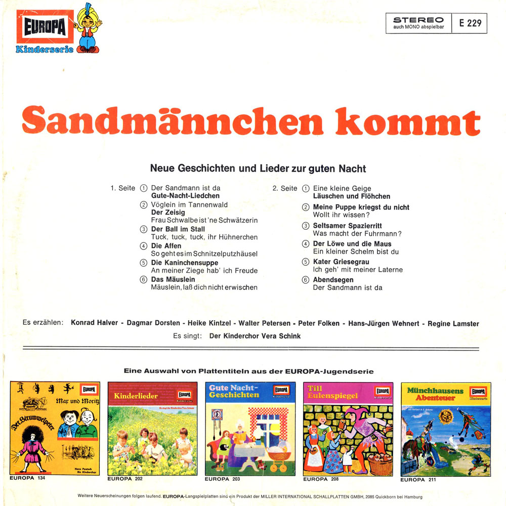 Gute Nacht-Liedchen (Gedicht) Der Zeisig (Gedicht) Der Ball im Stall (Gedicht) Die Affen (Gedicht) Die Kaninchensuppe (Märchen) Das Mäuslein (Gedicht) Läuschen und Flöhchen (Märchen) Meine Puppe kriegst du nicht (Gedicht) Seltsamer Spazierritt (Märchen) Der Löwe und die Maus (Märchen) Kater Griesegrau (Gedicht) Abendsegen (Gedicht)