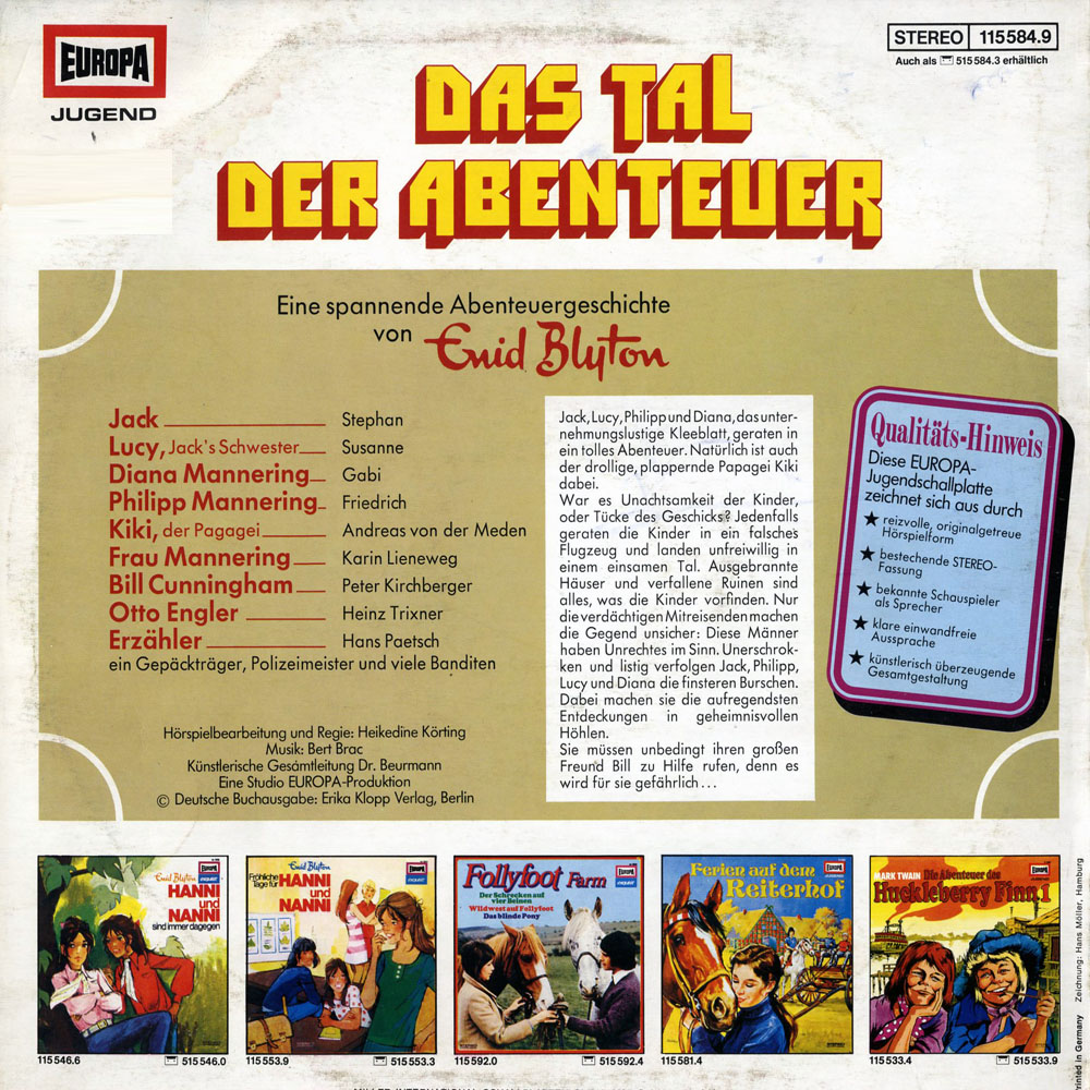 Anmerkung zu den Srechern: Auf der Plattenhülle wurden die Nachnamen der Sprecher der Kinderrollen nicht mit angegeben- ebenso nicht die Banditen, Polizisten u.a.