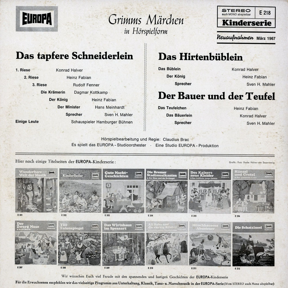 Trotz guter Sprecher eher mittelmäßig. Beim tapferen Schneiderlein wurden bei den Aufgaben das Einhorn und der Eber unterschlagen und weggelassen so grausam finde ich die Aufgaben jetzt nicht, dass man sie für Kinder auslässt. Da hätte man besser die anderen beiden Märchen weglassen können und beim Schneiderlein lieber Einhorn und Eber mit einbauen und eine zweite Seite machen können statt zu kürzen.