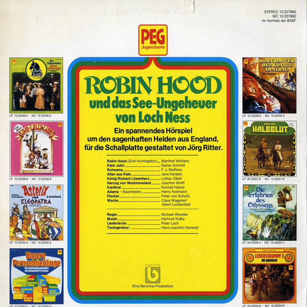 Ich kenne das Hörspiel "Robin Hood und das Ungeheuer von Loch Ness" aus meinen Kindertagen und suche nach einer Möglichkeit es heute auf CD zu käuflich zu erstehen. Es wäre toll, wenn eine Firma dieses und auch andere Hörspiele wieder herausbringen könnte (z. B. "die Irrfahrten des Odysseus" oder "Der Graf von Monte Christo" mit den atemberaubenden Sprechleistungen von Will Quadflieg und Wolfgang Kieling als Erzähler), denn es handelt sich bei diesen Produktionen um Klassiker unserer Zeit.