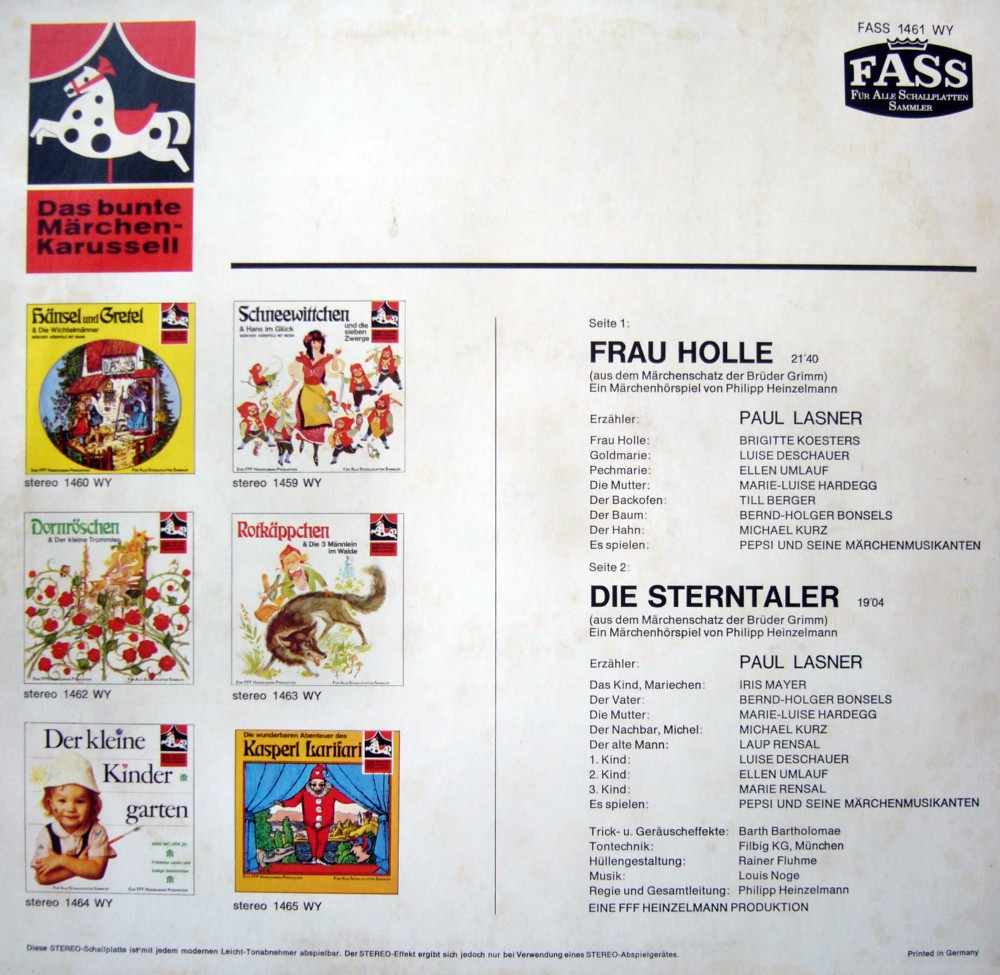Diese Platte ist wahrscheinlich meine allererste Schallplatte überhaupt. Die hatte ich schon ca. 1968. Interessant, wie Frauenberger & Co eine Geschichte wie "Die Sterntaler" so bearbeiteten, dass eine ganze LP-Seite voll wird - das Original-Märchen der Grimm Brothers gibt das nämlich eigentlich nicht her.