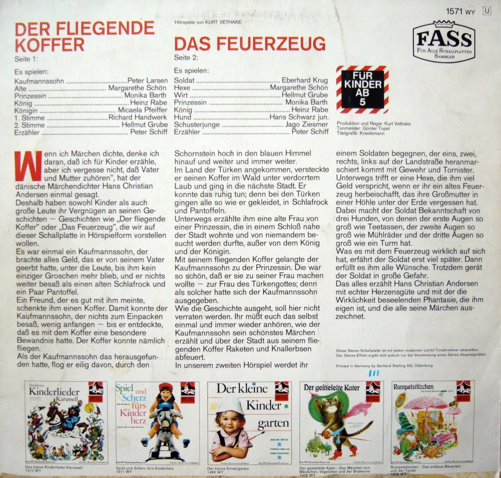 "Wenn ich Märchen dichte, denke ich daran, daß ich für Kinder erzähle, aber ich vergesse nicht, daß Vater und Mutter zuhören", hat der dänische Märchendichter Hans Christian einmal gesagt. Deshalb haben sowohl Kinder als auch große Leute ihr Vergnügen an seinen Geschichten - Geschichten wie "Der fliegende Koffer" oder "Das Feuerzeug", die wir auf dieser Schallplatte in Hörspielform vorstellen wollen. Es war einmal ein Kaufmanssohn, der brachte alles Geld, das ervon seinem Vater geerbt hatte, unter die Leute, bis ihm kein einziger Groschen mehr blieb, und er nichts weiter besaß als einen alten Schlafrock und ein Paar Pantoffel. Ein Freund, der es gut mit ihm meinte, schenkte ihm einen Koffer. Damit konnte der Kaufmanssohn, der nichts zum Einpacken besaß, wenig anfangen - bis er entdeckte, daß es mit dem Koffer eine besondere Bewandnis hatte. Der Koffer konnte nämlich fliegen.