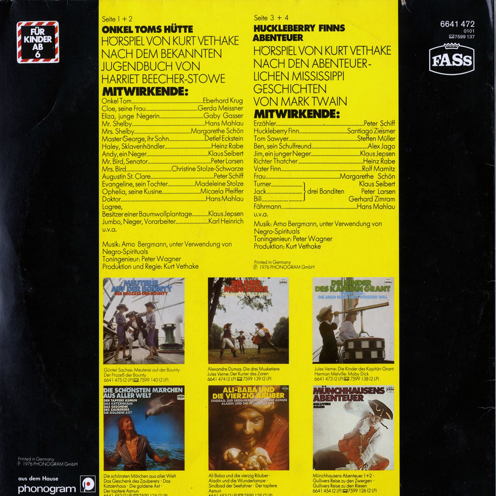 Prouktionsdaten zu: Onkel Toms Hütte insg.: 47 min Vorlage: Harriet Beecher-Stowe - 'Onkel Toms Hütte' Regie, Buch & Produktion: Kurt Vethake, Ton: Peter Wagner, Musik: Arno Bergmann & Negro-Spiritual: 'Go, Down, Moses, Way Down ...'