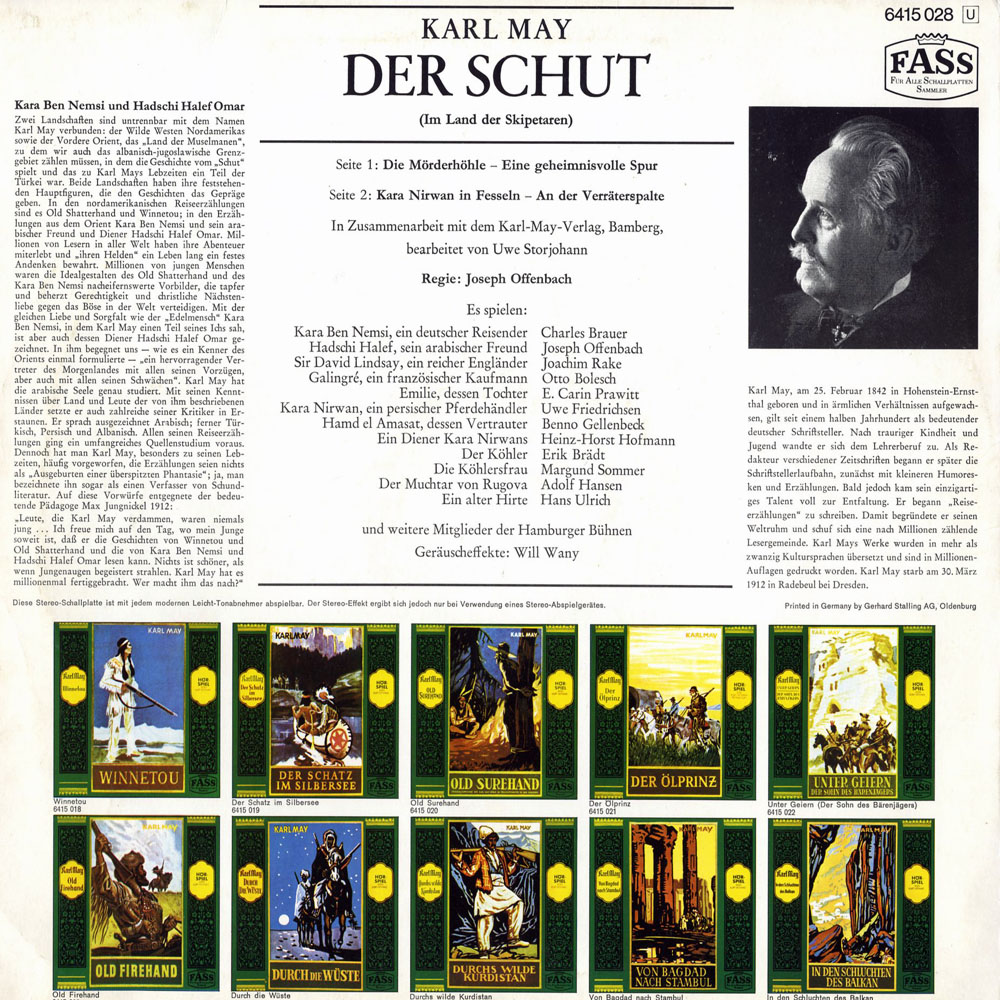 Parallel zum 'Bärenjäger' entstanden läßt diese Aufnahme nun Offenbach ebenso gekonnt als Hadschi Halef hören, während 'Winnetou' Brauer hier Kara spricht, kommt 'Shatterhand' Friedrichsen in der Titelrolle als hämisch auftrumpfender Schut zu Zuge. Die Bearbeitung von Uwe Storjohann interpretiert den Schut-Stoff mitunter etwas frei aber absolut gelungen: Endlich wird auch dem weiblichen Element mit der Galingré-Tochter Emilie der gebührende Platz eingeräumt (unvergleichlich: Joachim Rake als verliebter Gecko Lindsay), wobei die Kerker-Szenen einmal mehr zeigen, daß sich die Offenbach-Hörspiele nicht wirklich Aufnahmen für Kinder sind. Wie bei den 'Geiern' überstand diese Aufnahme unbeschadet die stereophone Einrichtung durch Kurt Vethake. Absoluter Kultsatz [mehrmals wiederholt]: 'Ich bin ein bettelarmer Mann und habe nichts gesehen und gehört ...'