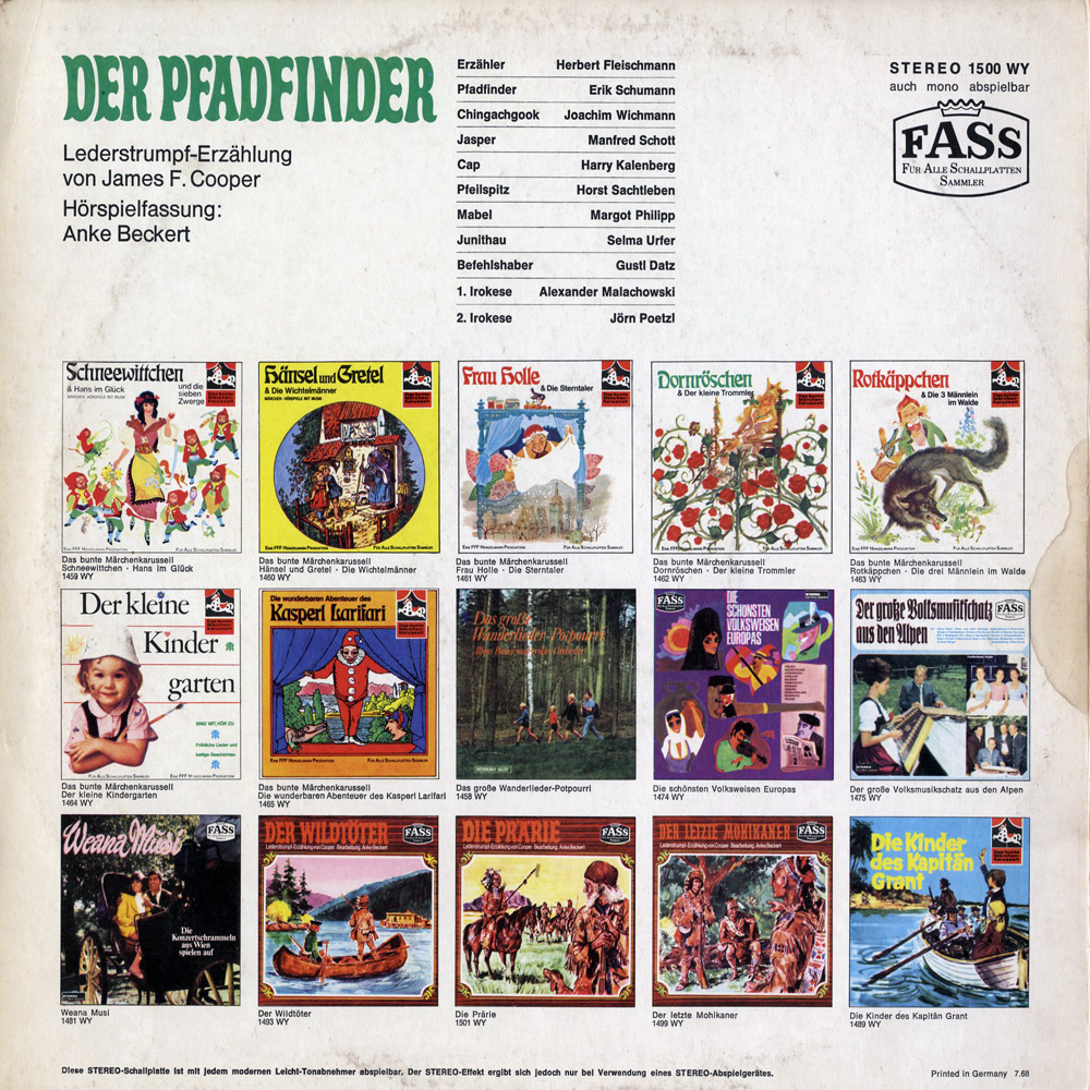 Produktionsdaten zu: Der Pfadfinder insg.: ca. 30 min insg. Vorlage: James Fenimore Cooper - 'Der Pfadfinder' Bearbeitung: Anke Beckert weitere Ausgaben [neben Philips/Fass]: Weltmelodie/Starlet Supertone, liliput/echo, Bärli Bella Musica [mit vertauschten Sprecherangaben]