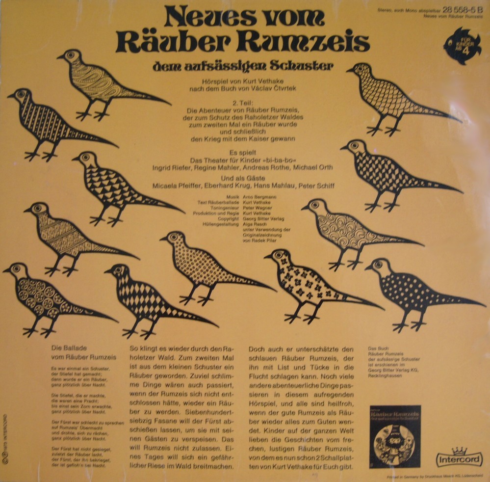 Noch viele andere abenteuerliche Dinge passieren in diesem aufregenden Hörspiel, und alle sind heilfroh, wenn der gute Rumzeis als Räuber wieder alles zum Guten wendet. Kinder auf der ganzen Welt lieben die Geschichten vom frechen, lustigen Räuber Rumzeis, von dem es nun schon 2 Schallplatten von Kurt Vethake für Euch gibt.