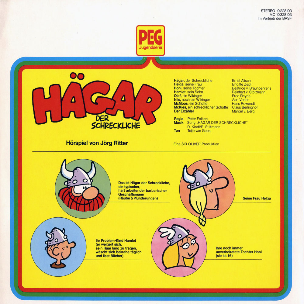 Eine Peter Folken-Solo-Produktion aus Heidelberg mit den üblichen Sprechern (u.a. Brigitte Zepf, Aart Veder und Folken als Erzähler). Ob sie sich exakt an die Comic-Vorlage hält, kann ich nicht beurteilen. Jedenfalls erleben Hägar (von Ernst Alisch ein wenig langweilig interpretiert) und seine Mannen hier zwei verschiedene Abenteuer, die natürlich jeweils mit einem Reinfall enden. Für mich ein weniger gelungenes Comic-Hörspiel mit schon damals recht abgestandenen Scherzen.