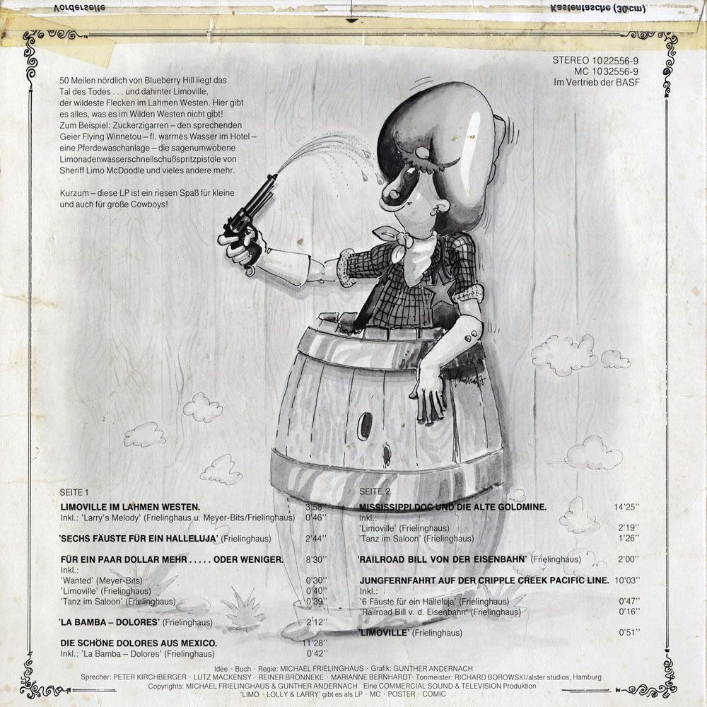 50 Meilen nördlich von Blueberry Hill liegt das Tal des Todes ... und dahinter Limoville, der wildeste Flecken im Lahmen Westen. Hier gibt es alles, was es im Wilden Westen nicht gibt! Zum Beispiel: Zuckerzigarren, den sprechenden Geier Flying Winnetou, fließendes warmes Wasser im Hotel eine Pferdewaschanlage, die sagenumwobene Limonadenwasserschnellschußspritzpistole von Sheriff Limo McDoodle und vieles andere mehr. Kurzum - diese LP ist ein riesen Spaß für kleine und auch für große Cowboys!