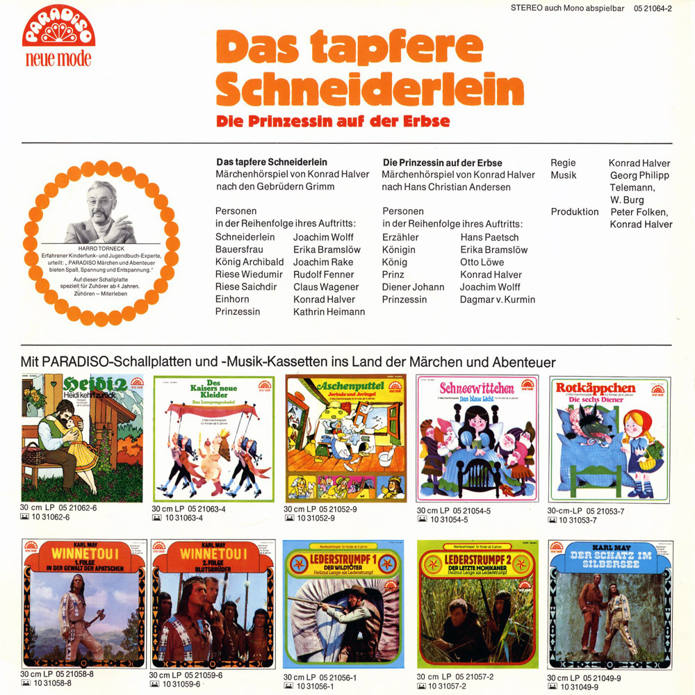 Diese Scheibe lief bei mir früher rauf und runter. Habe selten eine so witzig-ironische Vertonung des bekannten Märchens vom tapferen Schneiderlein zu Ohren bekommen. Joachim Wolff in Höchstform hat hörbar Spaß an der Umsetzung und der Veräppelung von Land und Leut (ich sag nur Marmeladenfrau) sowie der beiden Riesen 'Wiedumir' und 'Soichdir'. Die extra akzentuierte Umsetzung von der Prinzessin auf der Erbse läßt auch nichts zu wünschen übrig. Eine super Halver/Folken-Produktion !!!