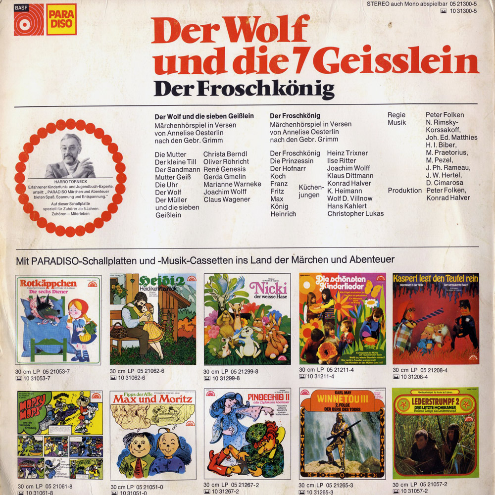 Hörspiel von Anneliese Oesterlin nach den Märchen der Brüder Grimm. Musik: N.Rimsky-Korssakoff, Joh. Ed. Matthies, H.I. Biber, M. Praetorius, M. Pezel, J. Ph. Rameau, J.W. Hertel, D. Cimarossa.