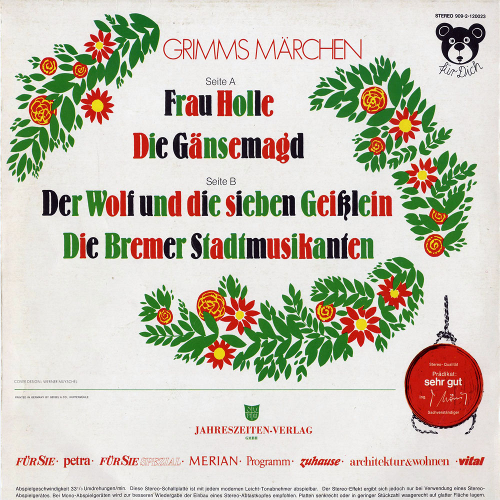 Seite 1: Horch was kommt von draußen rein/ Frau Holle/ Fuchs du hast die Gans gestohlen/ Die Gänsemagd/ Alle Vögel sind schon da Seite 2: Ich bin ein Bi- Ba- Butzemann/ Der Wolf und die sieben Geißlein/ Hänschen klein/ Die Bremer Stadtmusikanten/ Schlaf, Prinzchen, schalf