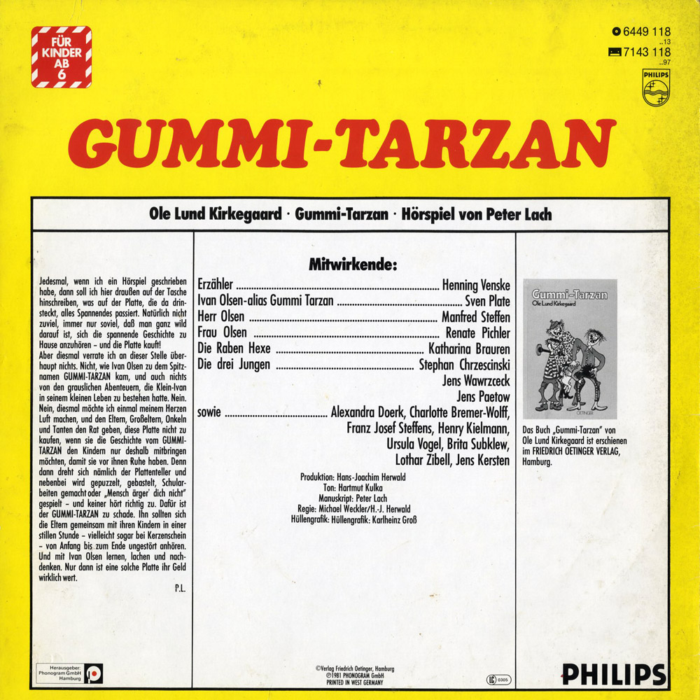 ?Gummi-Tarzan?, ein Hörspiel von Peter Lach, ist mir stark ans Herz gewachsen. Das 1981 produzierte Hörspiel bietet eine Sprechercrew dar, die wirklich einmalig ist. Zunächst haben wir den kleinen (armen) Ivan Olsen, den Gummi-Tarzan, welcher von Sven Plate gesprochen wird. Die Stimmlage des (damals) noch jungen Plate ist perfekt. Zu gerne nimmt man ihm den trotteligen, ungeschickten und naiven Ivan Olsen ab.