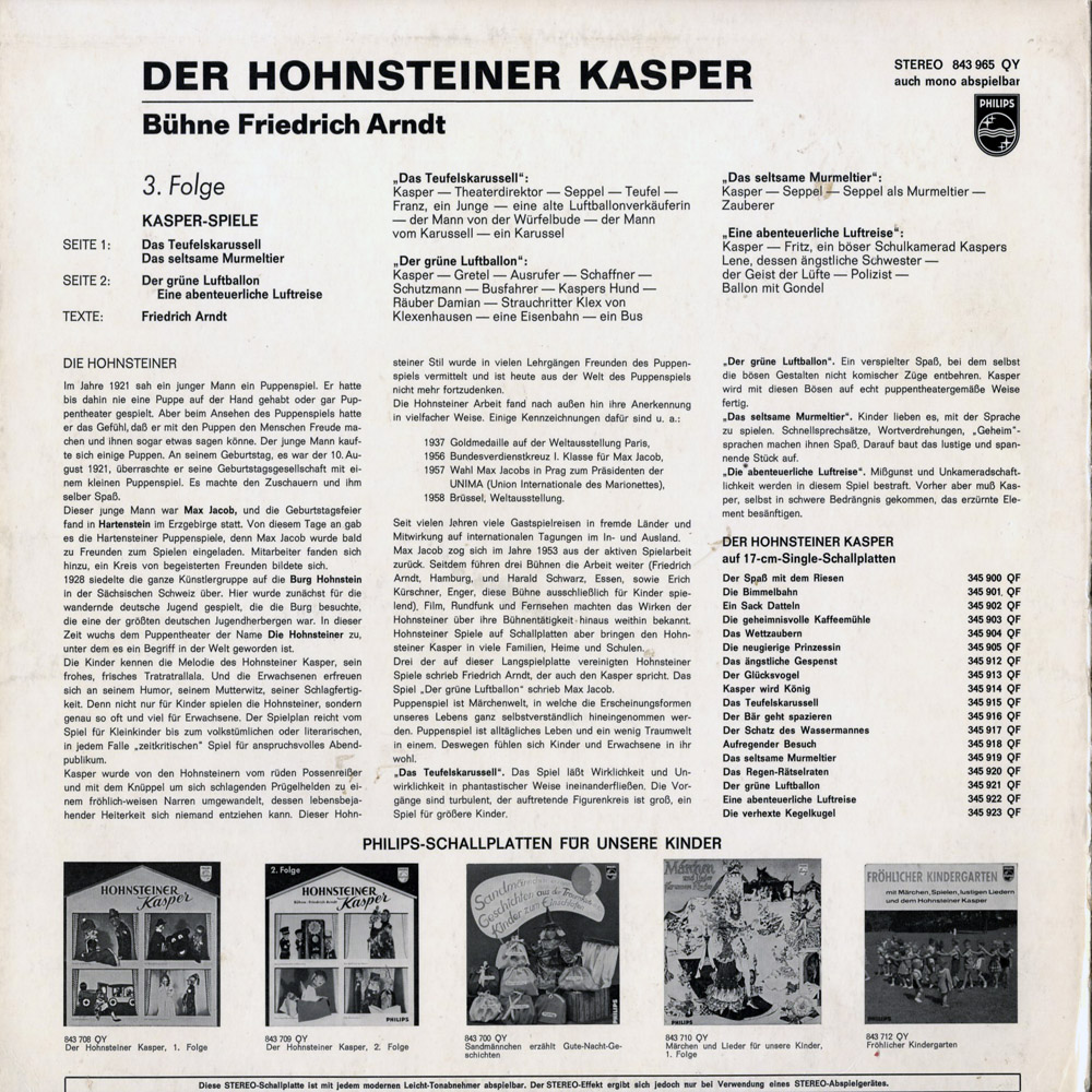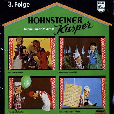 Die ersten 4 Folgen der Hohnsteiner-Kasper-Reihe unter dem Label Philips beinhalteten jeweils 3 Figurenbögen nebst Puppentheaterbühne im LP-Größenformat zum ausschneiden. Die Club-Sonderauflage (25cm-LP,Philips) ist darüberhinaus die einzige Hohnsteiner Kasper-LP,die ebenfalls über diese Art von Beilage verfügt.