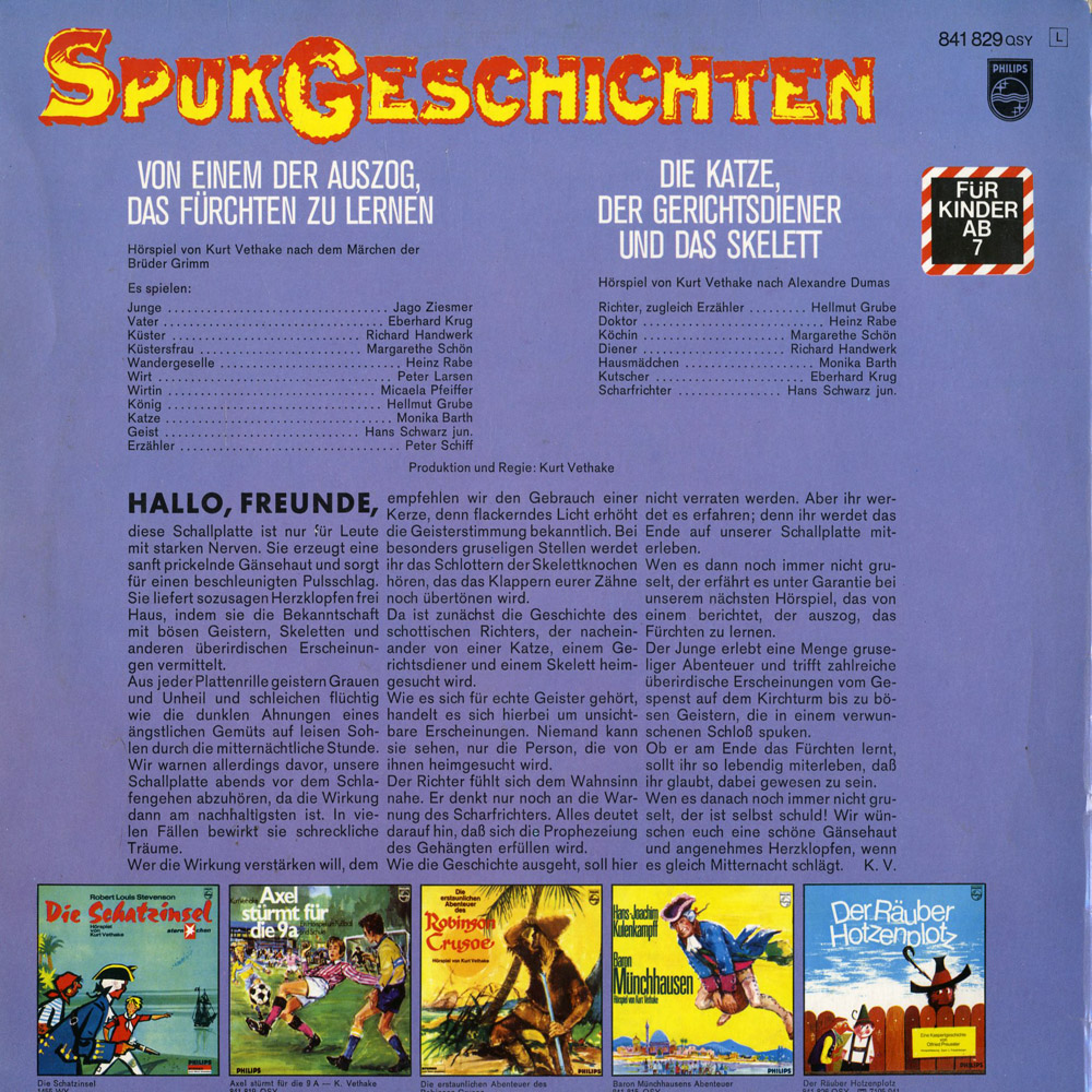 Mit "Die Katze, der Gerichtsdiener und das Skelett" ist eine - wie ich finde - für Kinder recht schwere Geschichte auf der B-Seite. Sie hat keinen "richtigen" Schluss, was sie für mich als Kind sehr unverständlich gemacht hätte. Dafür ist sie schön schaurig und entschädigt für die lahme A-Seite.