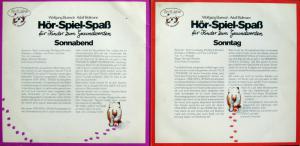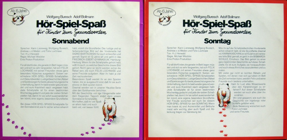 Bei dieser Hör-Spiel-Spaß-MusiCassette für den Sonnabend ist, wie ihr sicher schon erkannt habt, Violett die Grundfarbe. Das lustige und so farbenprächtige Bild auf der Vorderseite hat Sigrid Bartkowski für euch entworfen und gemalt. Sigrid ist 12 Jahre alt und geht in das Friedrich-Ebert-Gymnasium, Hamburg-Harburg. Wenn ihr die MusiCassette gehört habt, wisst ihr auch, zu welcher Geschichte dieses Bild gehört. Nicht ganz so leicht werden sicher die Rätsel sein, die euch Felix Lochnase und seine Freunde aufgeben. Aber ihr habt ja viel Zeit nachzudenken.