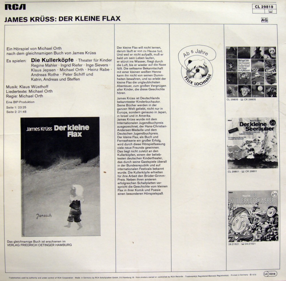 Der kleine Flax will nicht lernen, darum läuft er von zuhause fort. Und weil er nicht aufpasst, muss er bald um sein Leben laufen, er stürzt ins Wasser, fliegt durch die Luft, bis er wieder auf die Nase fällt. Die seltsame Bekanntschaft mit einer kleinen weißen Henne kann ihn nicht vor seinen Dummheiten bewahren, und so erlebt der kleine Flax die unglaublichsten Abenteuer, zum großen Vergnügen aller Kinder, die diese Geschichte hören.