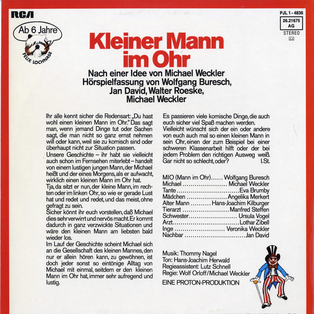 Ihr alle kennt sicher die Redensart: "Du hast wohl einen kleinen Mann im Ohr." Das sagt man, wenn jemand Dinge tut oder Sachen sagt, die man nicht so ganz ernst nehmen will oder kann, weil sie zu komisch sind oder überhaupt nicht zur Situation passen. Unsere Geschichte - ihr habt sie vielleicht auch schon im Fernsehen miterlebt - handelt von einem lustigen jungen Mann, der Michael heißt und dereines Morgens, als er aufwacht wirklich einen kleinen Mann im Ohr hat. Tja, da sitzt er nun, der kleine Mann, im rechten oder im linken Ohr, so wie er gerade Lust hat und redet und redet, und das meist ohne gefragt zu sein.