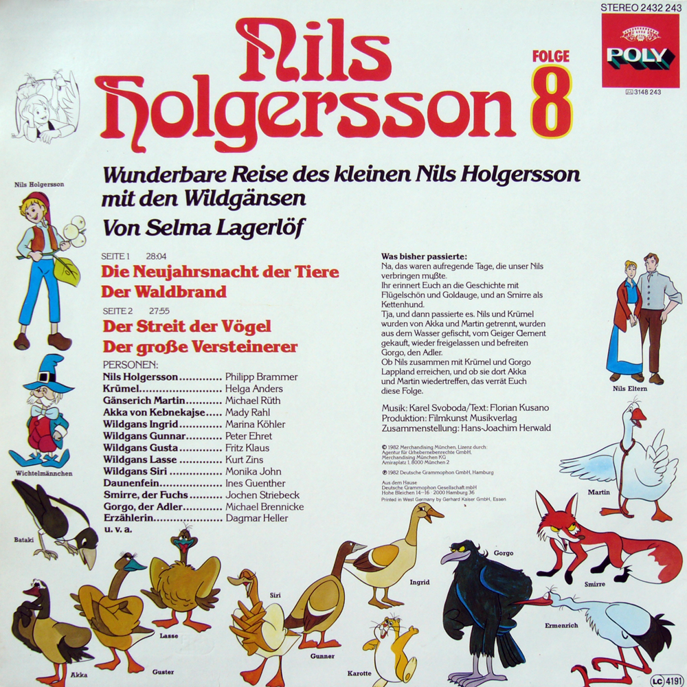 Na, das waren aufregende Tage, die unser Nils verbringen mußte. Ihr erinnert euch an die Geschichte mit Flügelschön und Goldauge, und an Smirre als Kettenhund. Tja, und dann passierte es. Nils und Krümel wurden von Akka und Martin getrennt, wurden aus dem Wasser gefischt, vom Geiger Clement gekauft, wieder freigelassen und befreiten Gorgo, den Adler. Ob Nils zusammen mit Krümel und Gorgo Lappland erreichen, und ob sie dort Akka und Martin wiedertreffen, das verrät euch diese Folge."