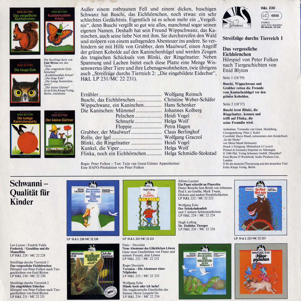 Außer einem rotbraunen Fell und einem dicken, buschigen Schwanz hat Buschi, das Eichhörnchen, noch etwas: ein sehr schlechtes Gedächtnis. Eigentlich ist es schon mehr ein "Vergeßnis", denn Buschi vergißt so gut wie alles, manchmal sogar seinen eigenen Namen. Deshalb hat sein Freund Wippschwanz, das Kaninchen, auch seine liebe Not mit ihm. Sie durchstreifen den Wald und stolpern von einem aufregenden Abenteuer ins andere. So verhindern sie mit Hilfe von Grubber, dem Maulwurf, einen Angriff der grünen Kobolde auf den Kaninchenhügel und werden Zeugen des tragischen Schicksals von Blinki, der Ringelnatter. Neben Spannung und Lachen bietet euch diese Platte eine Menge Wissenswertes über Tiere und ihre Lebensgewohnheiten (wie übrigens auch "Streifzüge durchs Tierreich 2: Die eingebildete Eidechse", H&L LP 231 / MC 22 231).
