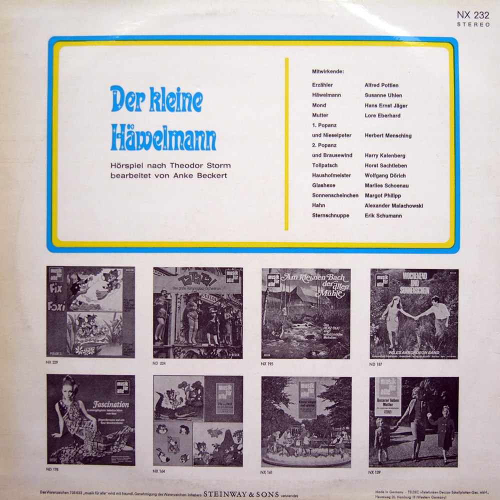 Diese Platte habe ich früher oft und gern bei Verwandten gehört. Leider ist sie mit noch etlichen anderen dieses Genres auf den Flohmarkt gewandert. Ich habe sie aber glücklicherweise - wenn auch in leicht abgewandelter Form - inzwischen wiederbekommen. Sie erschien nämlich im großen und ganzen auch auf Crystal. Die Dialoge der Decca-Version sind genauso übernommen worden, mit denselben Darstellern (liefere ich noch nach). Lediglich der Erzähler (Decca) wurde bei Crystal zu einer Erzählerin, und die Musik ist eine Andere. - Die Handlung ist auch hörenswert. Jeder, der das Märchen vom kleinen Häwelmann kennt, weiß, dass es nicht allzu lang ist und eigentlich keine LP füllt. Daher hat man noch eine Reihe von Figuren eingearbeitet, die das ganze zu einem fast in Richtung Kasperletheater gehenden Stück machen. Die Produktion stammt auf jeden Fall aus den 60er Jahren.