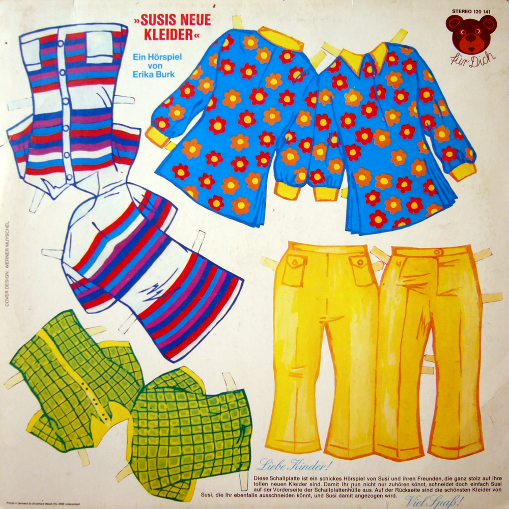 Diese Schallplatte ist ein schickes Hörspiel von Susi und ihren Freunden, die ganz stolz auf ihre tollen neuen Kleider sind. Damit ihr nun nicht nur zuhören könnt, schneidet doch einfach Susi auf der Vorderseite der Schallplattenhülle aus. Auf der Rückseite sind die schönsten Kleider von Susi, die ihr ebenfalls ausschneiden könnt, und Susi damit angezogen wird. Viel Spaß!