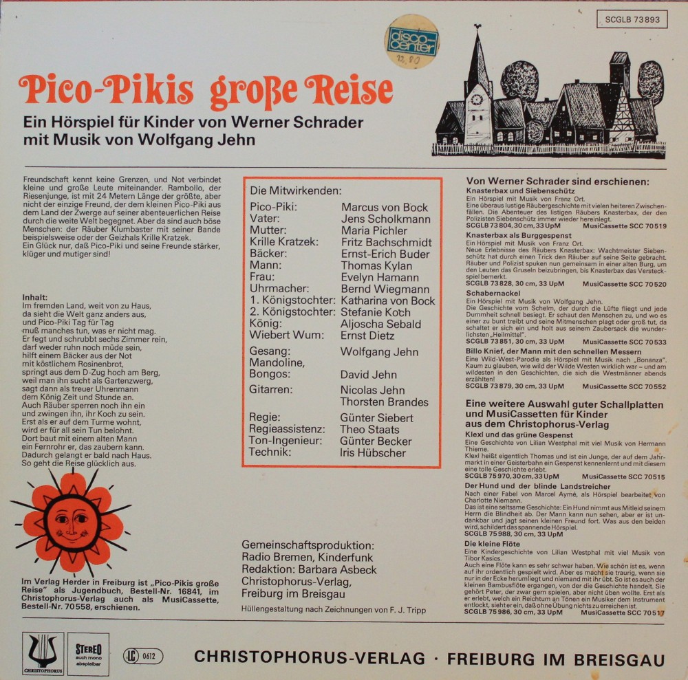 Im Verlag Herder in Freiburg ist "Pico-Pikis große Reise" als Jugendbuch, Bestell-Nr. 16841, im Christophorus-Verlag auch als MusiCassette, Bestell-Nr. 70558, erschienen.