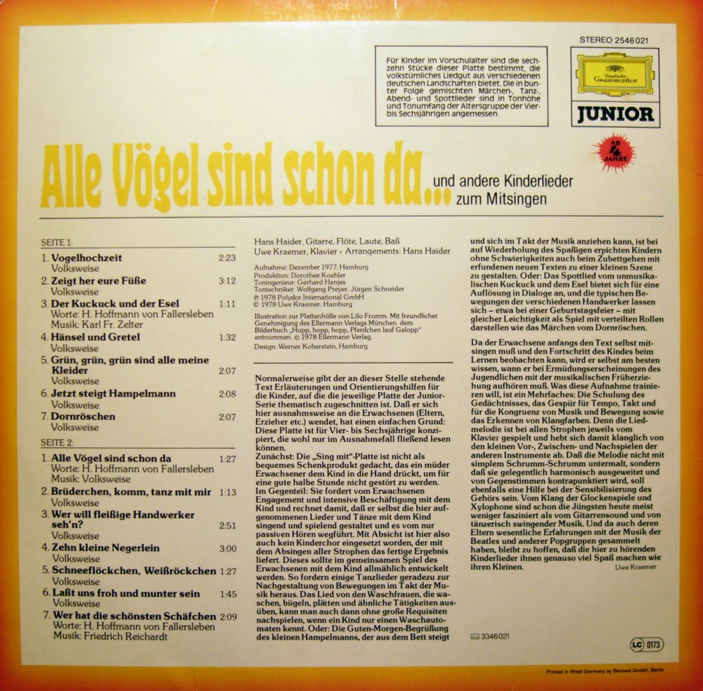 Normalerweise gibt der an dieser Stelle stehende Text Erläuterungen und Orientierungshilfen für die Kinder, auf die die jeweilige Platte der Junior-Serie thematisch zugeschnitten ist. Daß er sich hier ausnahmsweise an die Erwachsenen (Eltern, Erzieher etc.) wendet, hat einen einfachen Grund: Diese Platte ist Vier- bis Sechsjährige konzipiert, die wohl nur im Ausnahmefall fließend lesen können.