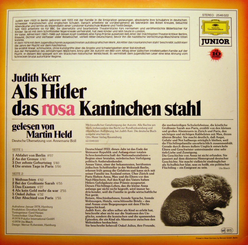 'Als H. das rosa Kaninchen stahl' (1973) ist eines der wichtigsten Jugendbücher der 70er Jahre und zu Unrecht heute weitgehend aus den Bücherregalen verschwunden. Meines Erachtens ist eines der wichtigsten Bücher zur N.-zeit - geschrieben aus der Sicht eines Emigrantenkindes. Hier: Judith Kerr (geb. 1923), Tochter des legendären Theaterkritikers im Berlin der zeit zwischen 1910 und 1933, Alfred Kerr (1867-1948). Das Buch schildert die Erlebnisse der Familie auf der Flucht aus Berlin über die Umwege in der Schweiz und Paris bis zur Ankunft in London. (Judith Kerr schrieb noch zwei Folgebände - 'Warten bis der Frieden kommt' 1975 und 'Eine Art Familientreffen' 1979 - die die weiteren Erlebnisse der Familie in der Emigration wiedergeben.)