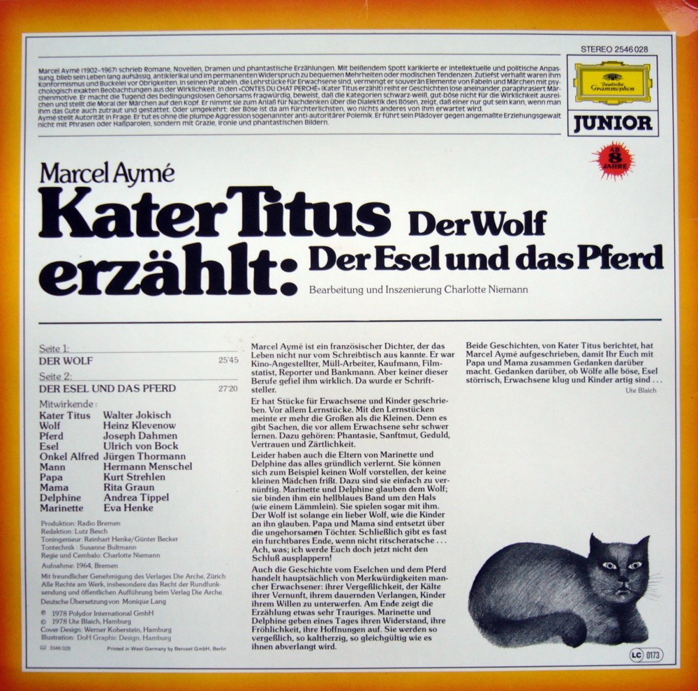 Beide Geschichten, von Kater Titus berichtet, hat Marcel Aymé aufgeschrieben, damit Ihr Euch mit Papa und Mama zusammen Gedanken darüber macht. Gedanken darüber, ob Wölfe alle böse, Esel störrisch, Erwachsene klug und Kinder artig sind …