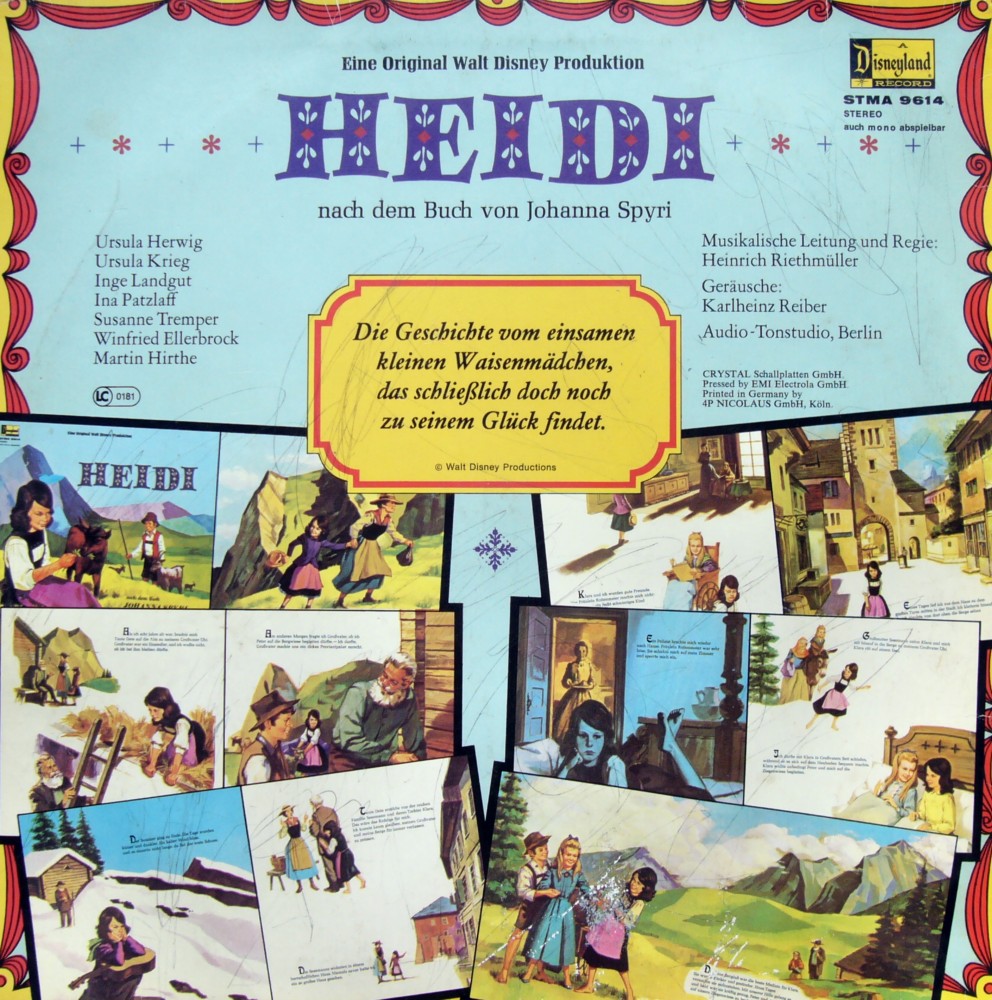 Heidi wird von ihrer Tante Dete zu ihrem Großvater auf die Alm gebracht. Nach einem Jahr holt die Tante sie wieder ab, um sie nach Frankfurt zur Familie Sesemann zu bringen. Dort soll Heidi die Gesellschafterin von Klara werden. Sie ist die einzge Tochter des reichen Kaufmannes und ist an den Rollstuhl gefesselt. Die beiden Mädchen freunden sich an und zum Schluß kann Heidi in ihre geliebten Berge zurück und hilft Klara dabei laufen zu lernen.