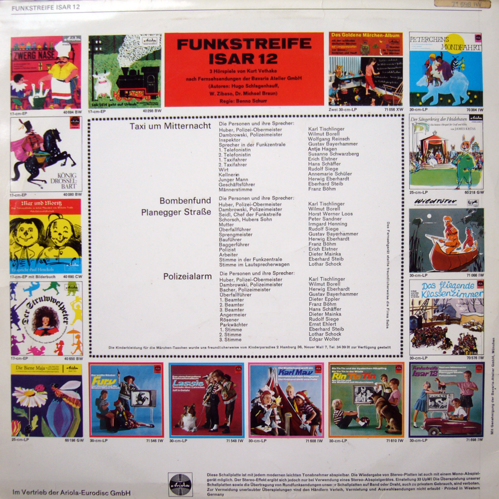Das ist etwas für Freunde des Mundarthörspiels. Auf dieser LP sind 3 Kurzhörspiele versammelt, die 3 Episoden der bekannten Fernsehserie des Bayerischen Rundfunks (die übrigens derzeit mal wieder im BR wiederholt wird) nachempfunden sind. Ich schreibe ausdrücklich "Nachempfunden", denn diese Geschichten wurden speziell für die Schallplatte neu produziert. Das einzige, was neben der eigentlichen Handlung genauso ist wie im Fernsehen, ist der Hauptdarsteller Karl Tischlinger, dessen Serienrolle ich gerade nicht weiß (weitere Angaben zur Besetzung später). Die Produktion erfolgte wahrscheinlich um 1963; die Aufnahmen sind sämtlich mono, und die Hintergrundmusikeinspielungen in der 1. Episode "Taxi um Mitternacht" deuten auf dieses Jahr hin. - Ich bekam diese Platte etwa 1975 geschenkt; damals lebte ich noch in der Nähe von Bremen und hatte mit bayrisch so meine Probleme. Ein paar Jahre später, als ich dann etwas weiter Südlich wohnte und viele Mitschüler, die von noch weiter südlich kamen, konnte ich dann alles verstehen.